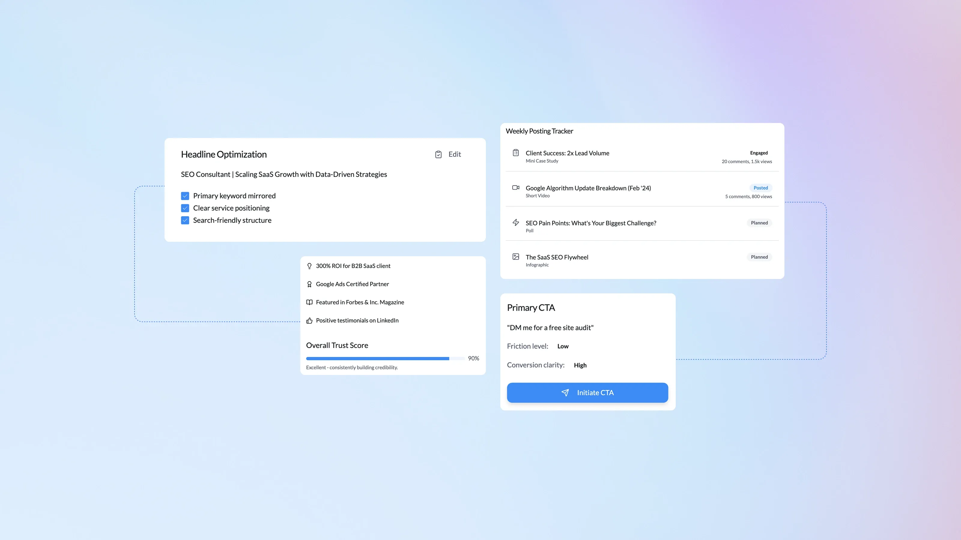 Optimize LinkedIn headlines, “About” text, and weekly posts around core keywords.